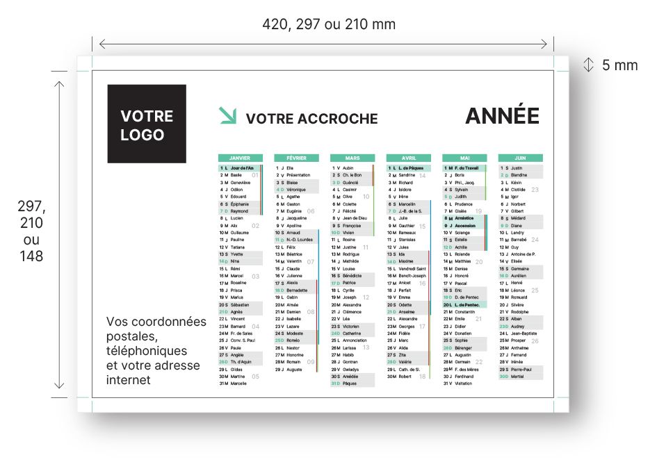 Disponible en formats A3 (420 x 297 mm), A4 (297 x 210 mm) et A5 (210 x 148 mm), ce calendrier mural personnalisé s’adapte à tous les environnements professionnels. Il peut intégrer les congés scolaires et être conçu en version recto ou recto-verso selon vos besoins.