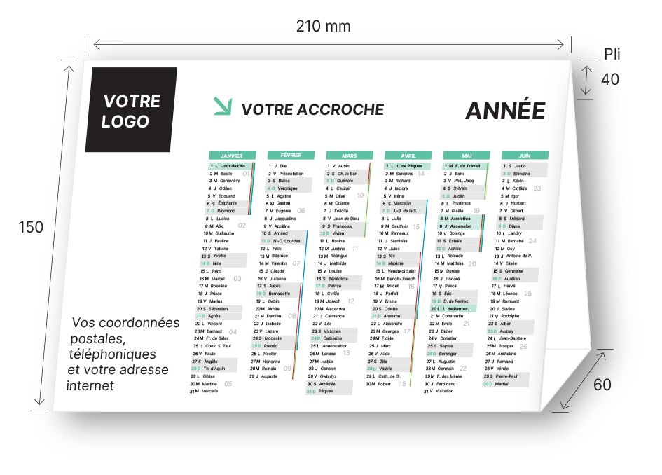 Le chevalet simple est un calendrier de bureau pratique, économique et particulièrement efficace pour maintenir votre marque visible toute l’année. Installé sur un comptoir, un bureau ou une banque d’accueil, il assure une présence constante auprès de vos clients, partenaires et collaborateurs. Grâce à son format compact et stable, le calendrier chevalet simple offre une lecture claire des mois tout en mettant en avant votre logo, vos coordonnées ou votre message commercial.